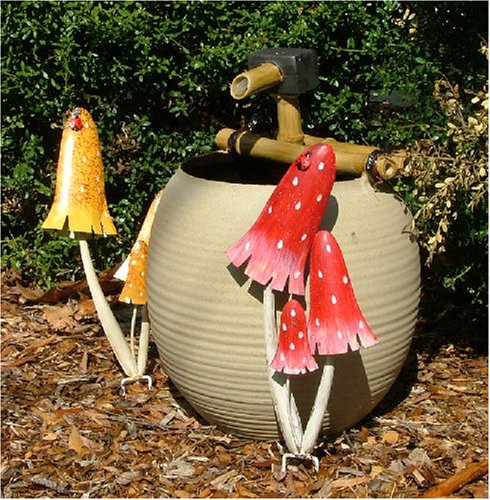 This beautiful water fountain will add beauty to your landscape as well as create the soothing and peaceful sound of water bubbling. This fountain would work well in your garden, on your patio, or anywhere you want to create a focal point area.. It is fairly heavy, so once you get it set up with water flowing, you wont want to move it immediately. It comes complete with a pump and is ready to be plugged in a run. The top pieces looks like bamboo with a bamboo spout but actually is made of ceramic as well. The outer casing is a soothing beige with a rippled look and the inside is a dark brown. The entire piece is hand crafted and hand painted and will make for a beautiful focal point in your garden. Add rocks around the base to make it look larger. Our picture shows the fountain with our metal mushrooms, but taller and shorter plants would look outstanding as well. Size is 17 inches high x 11 inches in diameter.
