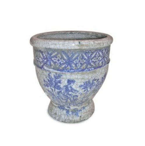 Our collection of iron benches, stools and tables accessorized by stone and ceramics set the stage for the great outdoors. White and Blue Crackle Urn with Banding 8 H x 7.5 Dia