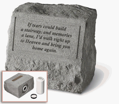 Headstone-Urn memorial engraved with - If tears could build a stairway and memories a lane I d walk right up to heaven and bring you home again. Kay Berry products are made of cast stone in Saxonburg PA. They are made to be weatherproof. Dimensions 9.5in x 5in x 8in.