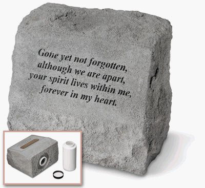 Headstone-Urn memorial engraved with - Gone yet not forgotten although we are apart your spirit lives within me forever in my heart. Kay Berry products are made of cast stone in Saxonburg PA. They are made to be weatherproof. Dimensions 9.5in x 5in x 8in.