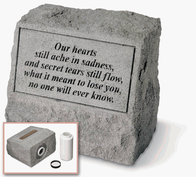 Headstone-Urn memorial engraved with - Our hearts still ache in sadness and secret tears still flow what it meant to lose you no one will ever know. Kay Berry products are made of cast stone in Saxonburg PA. They are made to be weatherproof. Dimensions 9.5in x 5in x 8in.