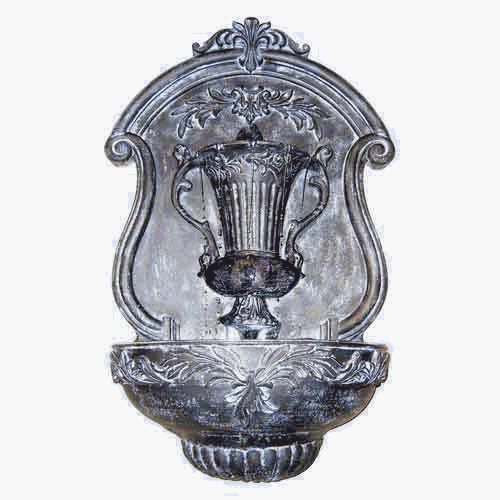 Classic in design this urn wall fountain with a lead finish makes a beautiful statement in any garden or patio area. Styled with an ornate shield back the center features a raised urn shaped cup that water flows in to from above and overflows to a lower bowl. It is constructed of weather-resistant composite resin and can be used indoors or outdoors. Dimensions - 18W x 29H x 8D inches