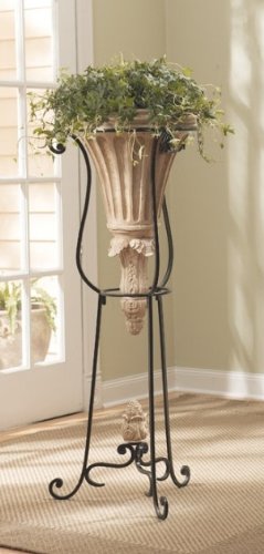 - This set of 2 planter with stand set features with fluted urn design, garland finial accent, scroll leg base and vanilla and black rust finish.