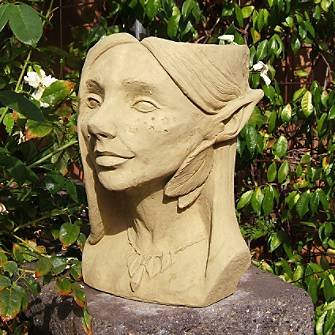 Bring a little bit of magic to your garden with our Fairy Head Planter. Designed by artist Michael Gentilucci, this planter has stars for freckles and hand-crafted feather and stone jewelry. Filled with flowers or spilling over with ivy, she'll add enchantment with her sculpted face and whimsical fairy ears.Cast from real stone. Drainage holes keep soil from getting oversaturated. Can also accommodate a 6" container. Use indoors or out.