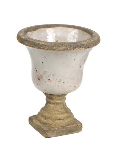These distressed decorative earth tone glazed urns feature a pedestal style base